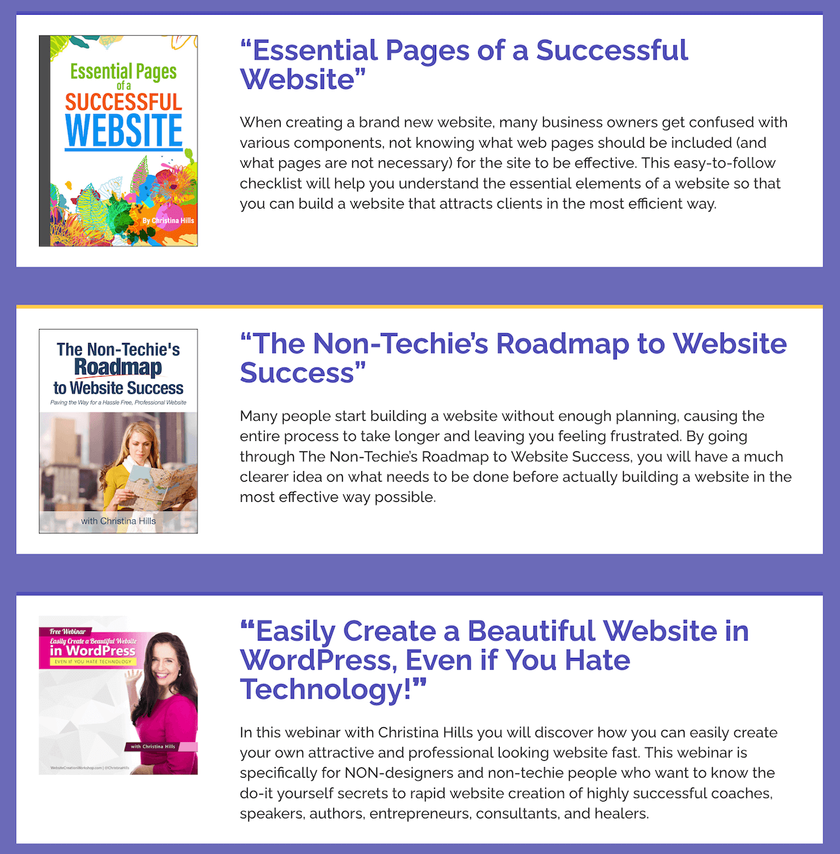 DESCRIPTION: This is a live webinar with Christina Hills. In this webinar you will discover how you can easily create your own attractive and professional looking website fast. This webinar is specifically for NON-designers and non-techie people who want to know the do-it yourself secrets to rapid website creation of highly successful coaches, speakers, authors, entrepreneurs, consultants, and healers.